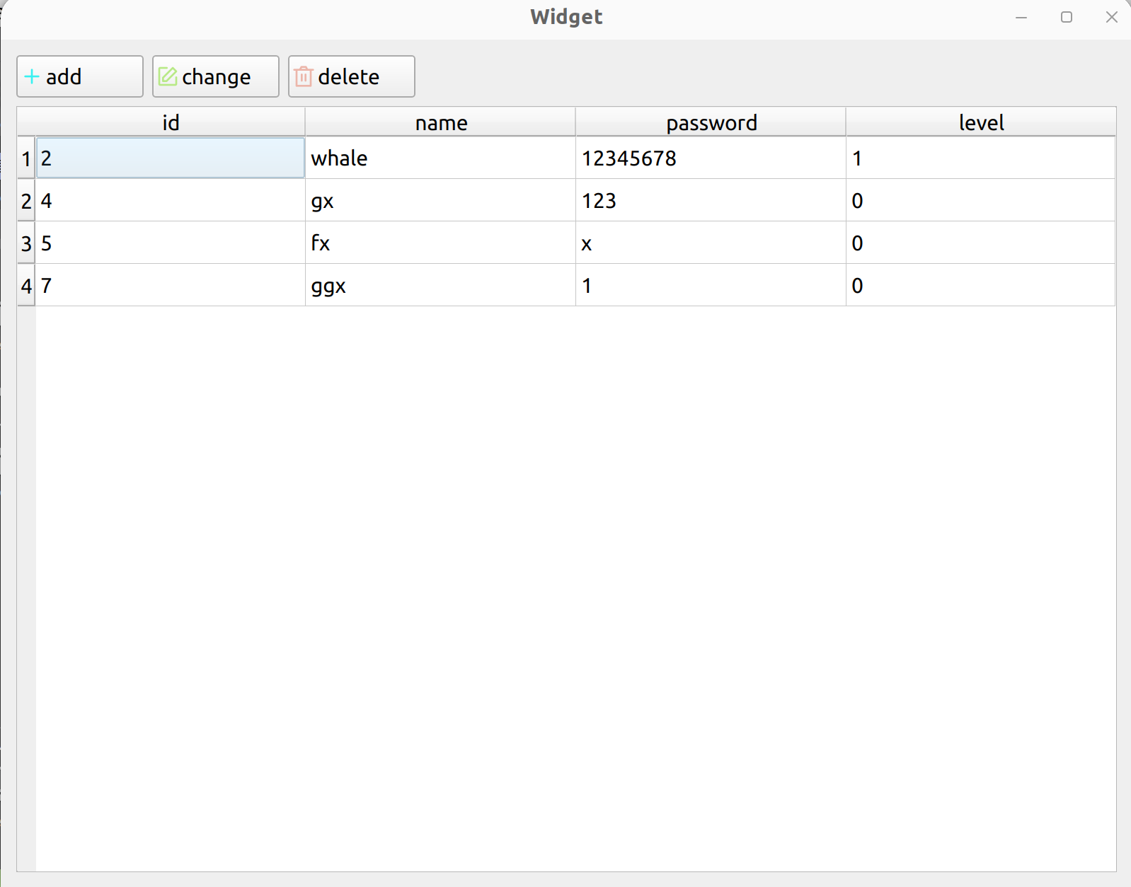在软件开发过程中,只要涉及到管理系统都需要使用到数据库。 什么是数据库? 数据库是一个有组织的数据集合,通常以电子形式存储在计算机系统中。它允许用户高效地存储、检索、更新和管理数据。 熟悉数据库的都知道,数据库的主要操作是增删改查。 以下创建一个TEST的表单,其属性为id, name和password。其中id为关键字。 创建表单 删除表单数据 添加表单数据 查询表单数据 SELECT * FROM TEST WHERE name = "whale" 更新表单数据 效果图 此处使用Qt创建一个用户管理系统,实现数据的新增改查。 效果图如下: 传送门